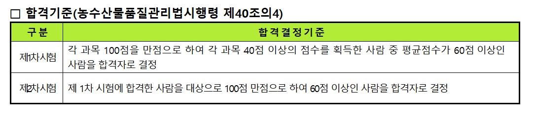 - 합격 기준: 1차 필기시험은 각 과목 40점 이상, 전 과목 평균 60점 이상을 득점해야 합격합니다. 2차 실기시험은 60점 이상을 득점해야 최종 합격입니다.